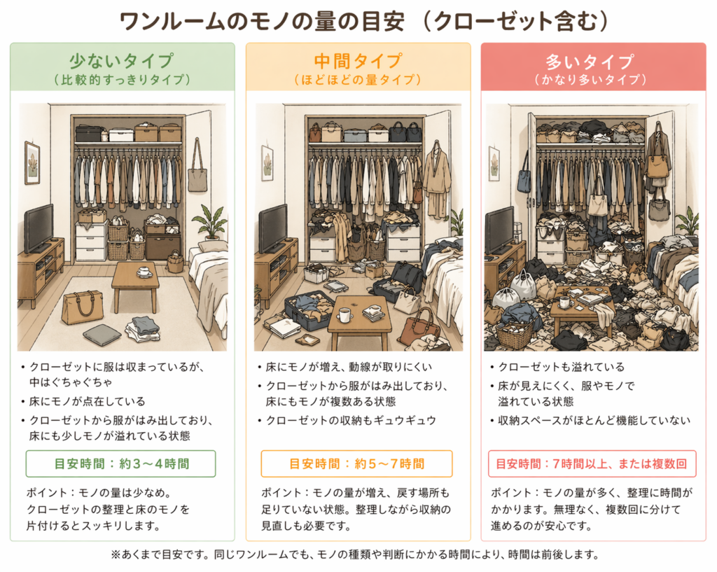 「モノの量・モノへの判断・間取り」から見た片付け時間の目安を