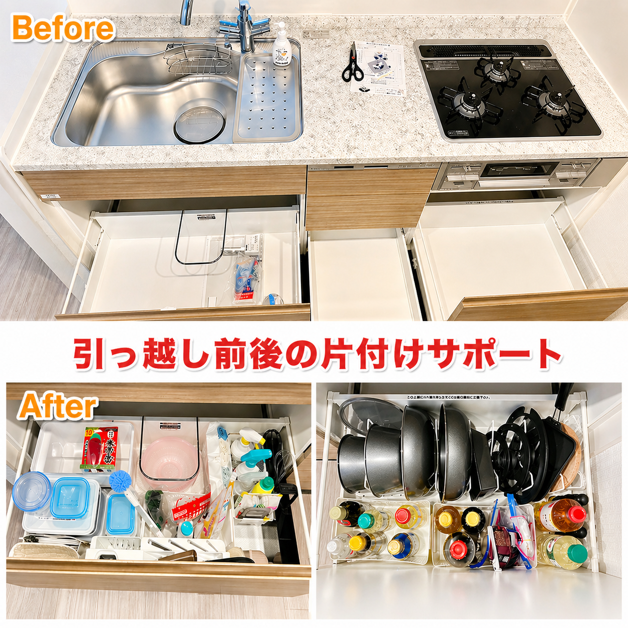 片付けに加え、水まわりの掃除、家具の配置アドバイス、書類整理など、